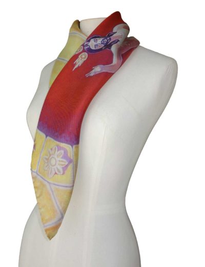 Realizados en 100% seda italiana de alta calidad de acabado suave y delicada caída. Todos nuestros pañuelos están creados a partir de una obra de arte original. A partir de ella, se procede al minucioso diseño de cada modelo para su estampación en seda, en la región de Como-Milán, reconocida internacionalmente por la extraordinaria calidad de producción de sus sedas y acabados de las prendas. Una vez impresa, se procede, allí también, a cortar cada pañuelo y posterior enrollado de los bordes y su cosido a mano.